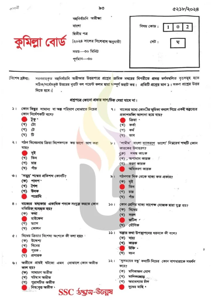 SSC Bangla 2nd Paper MCQ Solution 2026 – কুমিল্লা বোর্ড